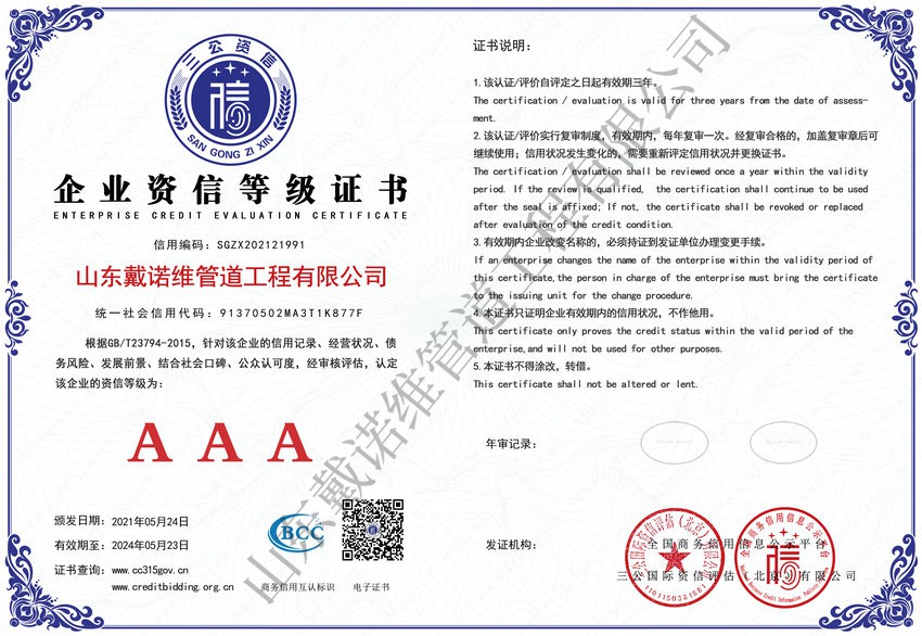 管道非開挖修復(fù)工程服務(wù)企業(yè)資質(zhì)證書