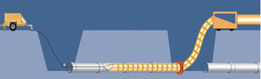 內襯復合軟管的修復工藝是將外徑等于或略小于舊管道內徑的復合管,通過變形設備將柔性復合管軋成“U”型并暫時捆綁使其直徑減小,通過牽引機將柔性復合管穿入舊管道,然后用水或壓縮空氣將其漲開恢復到原來的直徑,使內襯管貼到舊管道的內壁上,形成合二為一的“管中管”復合結構。
